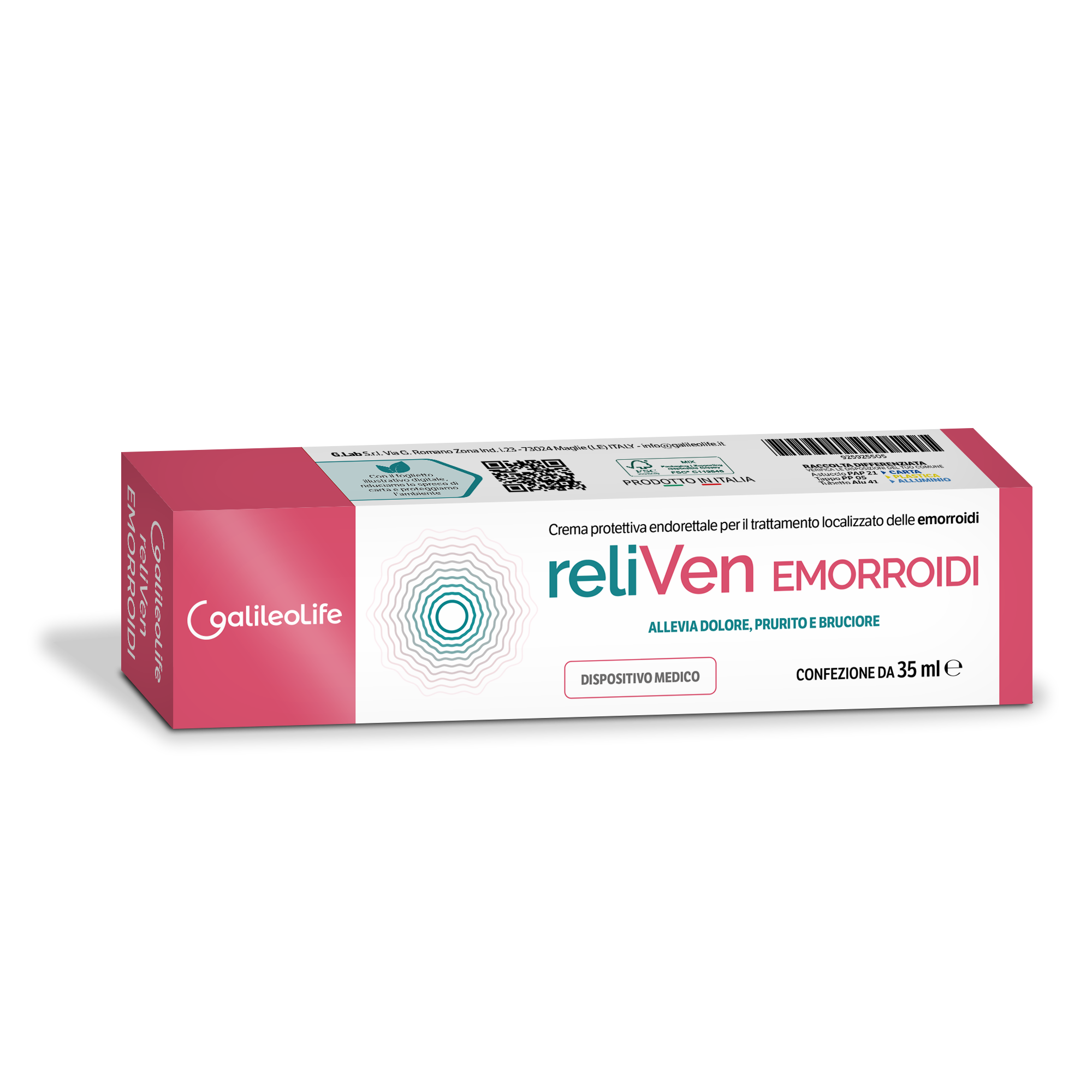 RELIVEN EMORROIDI è un dispositivo medico di classe I in crema protettiva endorettale, indicata come coadiuvante per il trattamento della sindrome varicosa emorroidaria (emorroidi esterne ed interne) e le irritazioni della cute e della mucosa anale e perianale.